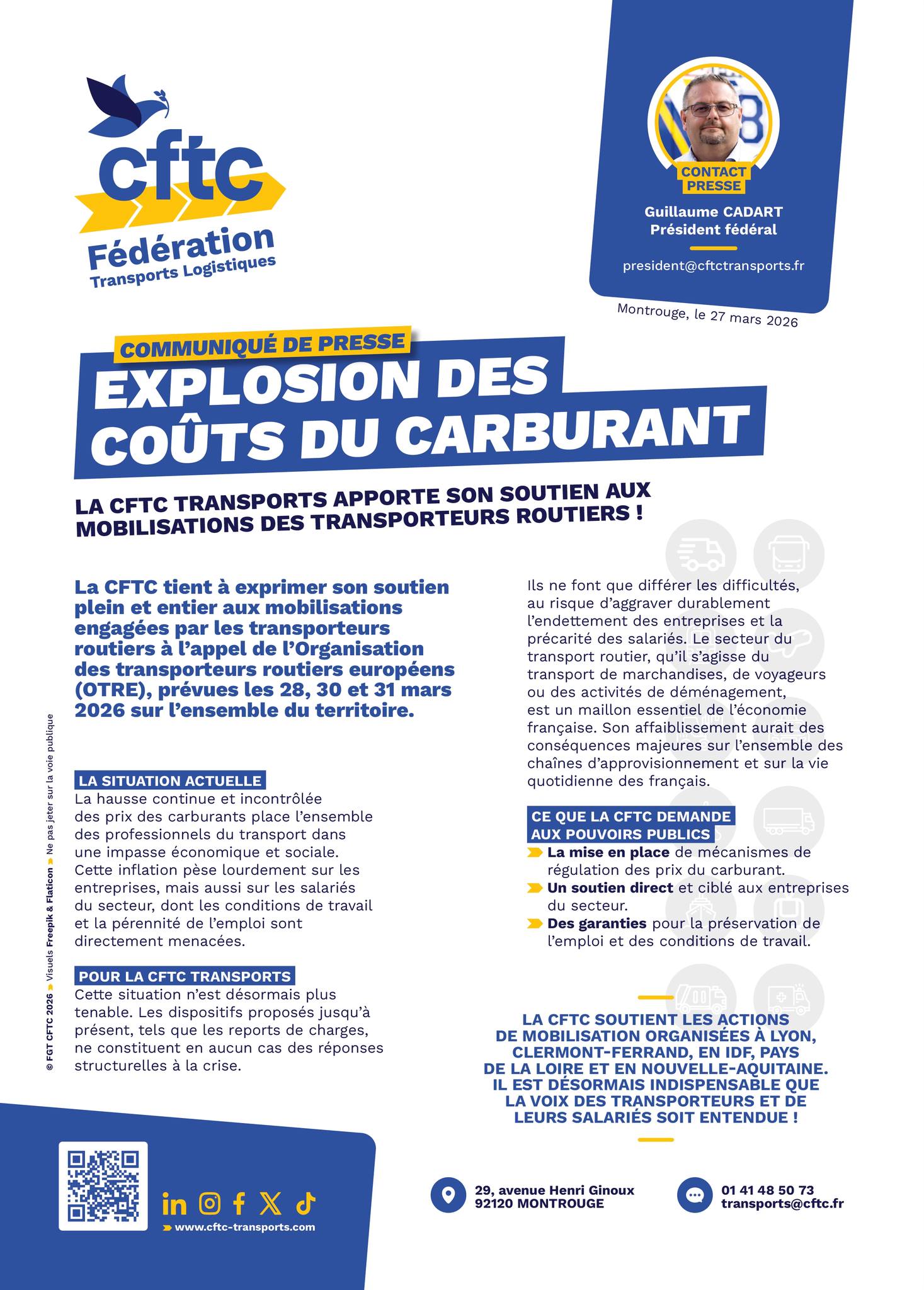 Dans ce communiqué du 27 mars 2026, la Fédération CFTC Transports & Logisitque apporte son soutien aux mobilisations des Transports Routiers.