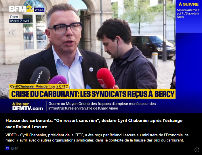 Reçu par le ministre de l’Économie Roland Lescure ce mardi 7 avril pour évoquer les conséquences de la hausse du prix des carburants, le président de la CFTC, Cyril Chabanier, a regretté l’absence de mesures ambitieuses de la part du gouvernement pour accompagner les salariés dans ces temps difficiles :