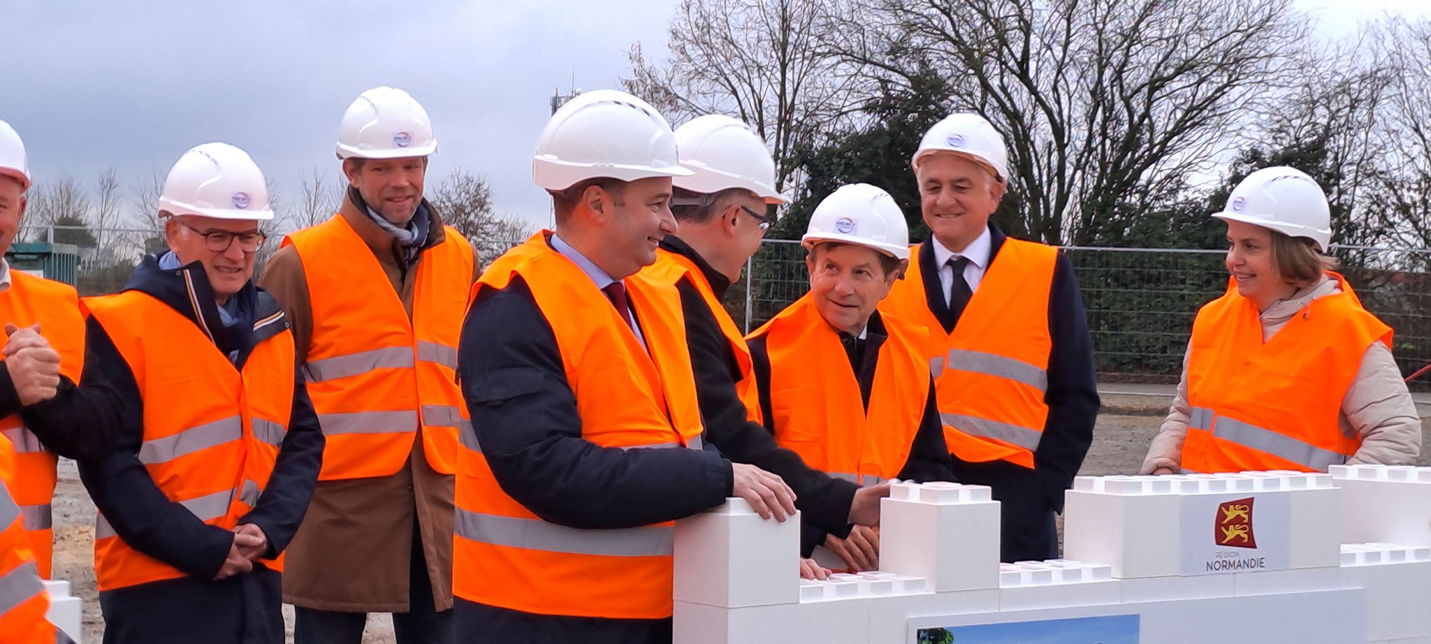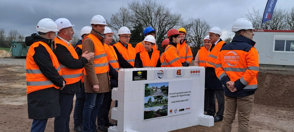 Pose de la 1ere pierre du Campus de l’Apprentissage de l’école des Travaux Publics de Normandie à Alençon (Orne), en présence du Président de la Région Normandie, M. Hervé Morin.
